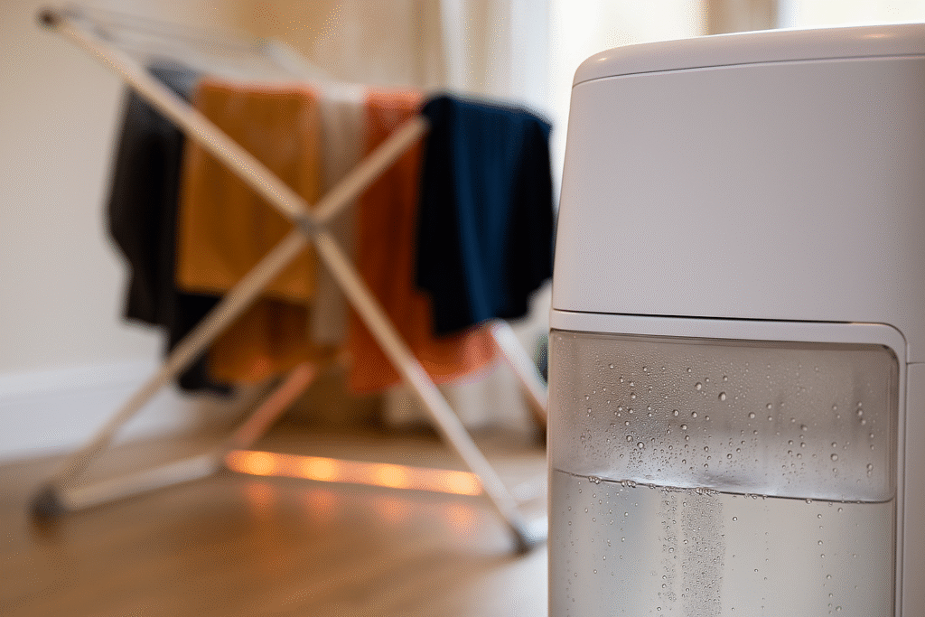 Heated airers gently warm your clothes, speeding up evaporation. But that moisture doesn’t vanish — it lingers in the air, raising humidity and slowing drying. A dehumidifier extracts that moisture, keeping humidity low and helping clothes dry faster and more thoroughly.