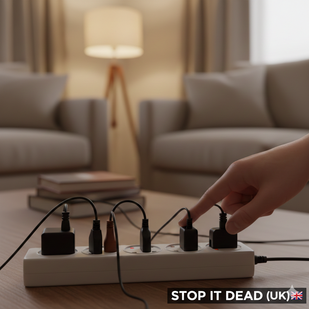UK sockets have switches — use them. For multi-device setups, extension leads with individual switches make it easy.