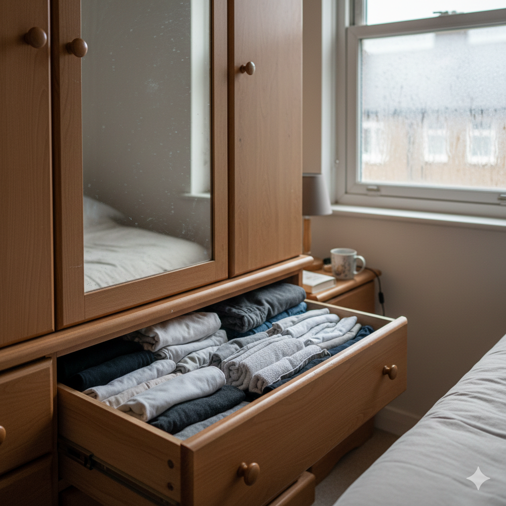 In small flats, people often rush this step because airers are in the way. Unfortunately, sealing even mild dampness into a drawer or wardrobe almost guarantees smells later.
